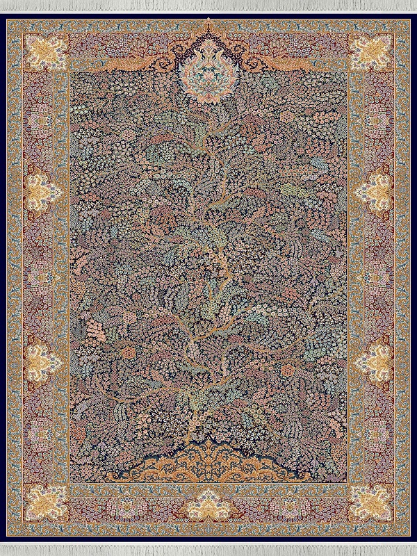 فرش 1500 شانه طرح باغ گلشن با تراکم 4500 در رنگ سرمه ای و تمامی ابعاد و رنگبندی سرمه ای در شرکت فرش یلدای کویر کاشان بافت میشود. مشابه این فرش در فرش دستبافت نیز هست که به نقشه درختی معروف است. ظرافت این نقشه و رنگبندی داخل طرح ها باعث چشمگیری بیشتر این نقشه شده است و میتواند به تنهایی به خانه شما روح ببخشد.